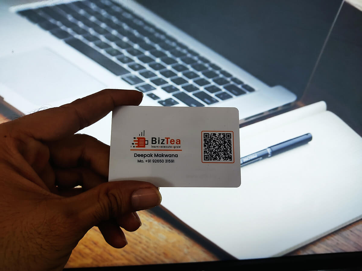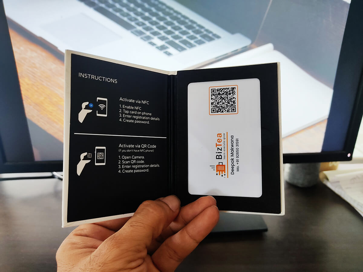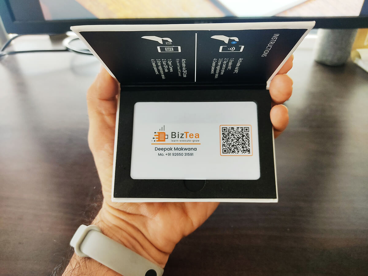 A Business card with NFC chip or NFC business card uses wireless technology for quick data exchange with compatible devices upon tapping.